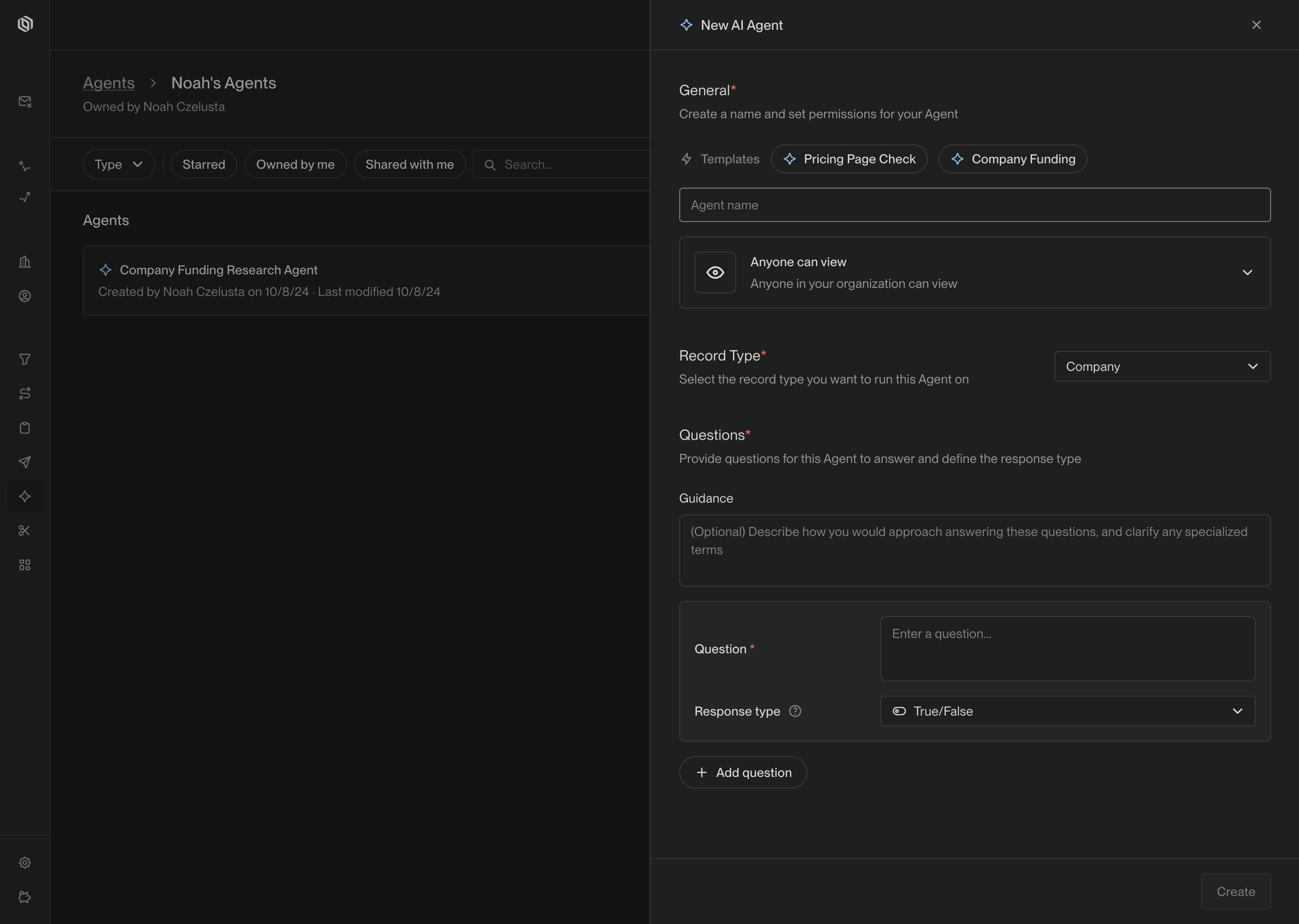 Agents can run on Companies or People. Data from Unify for the underlying records will be made available to the Agent as it performs research to answer your questions. For example, an agent intended to perform account qualification will run on company records. On the other hand, an agent that researches individual people for lead qualification will run on person records.Once you save an Agent, you cannot change its record type.