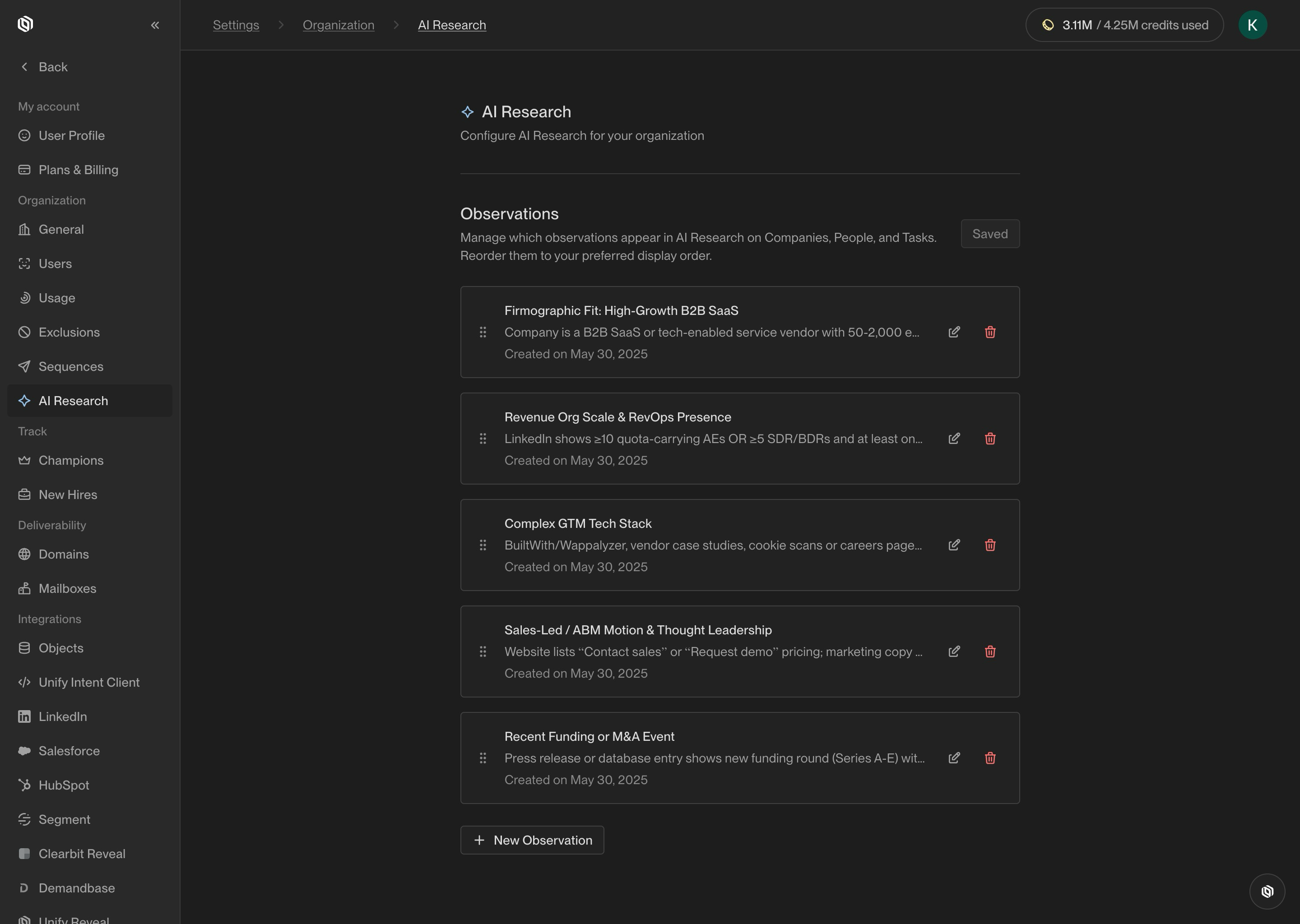 When you onboard to Unify, our multi-agent system conducts research on your Company to understand your products, customers, and value proposition. The system uses this information about your Company to analyze and assess what insights you may consider important when evaluating prospect Companies, and creates Observations for those insights. These Observations are the default set of insights that Unify will use to generate AI Research reports for you.An Observation is a key piece of information that the system will try to find for a given Company.