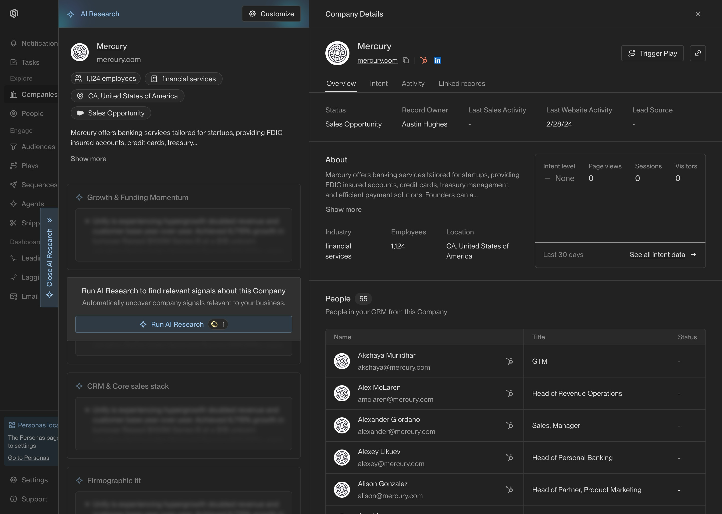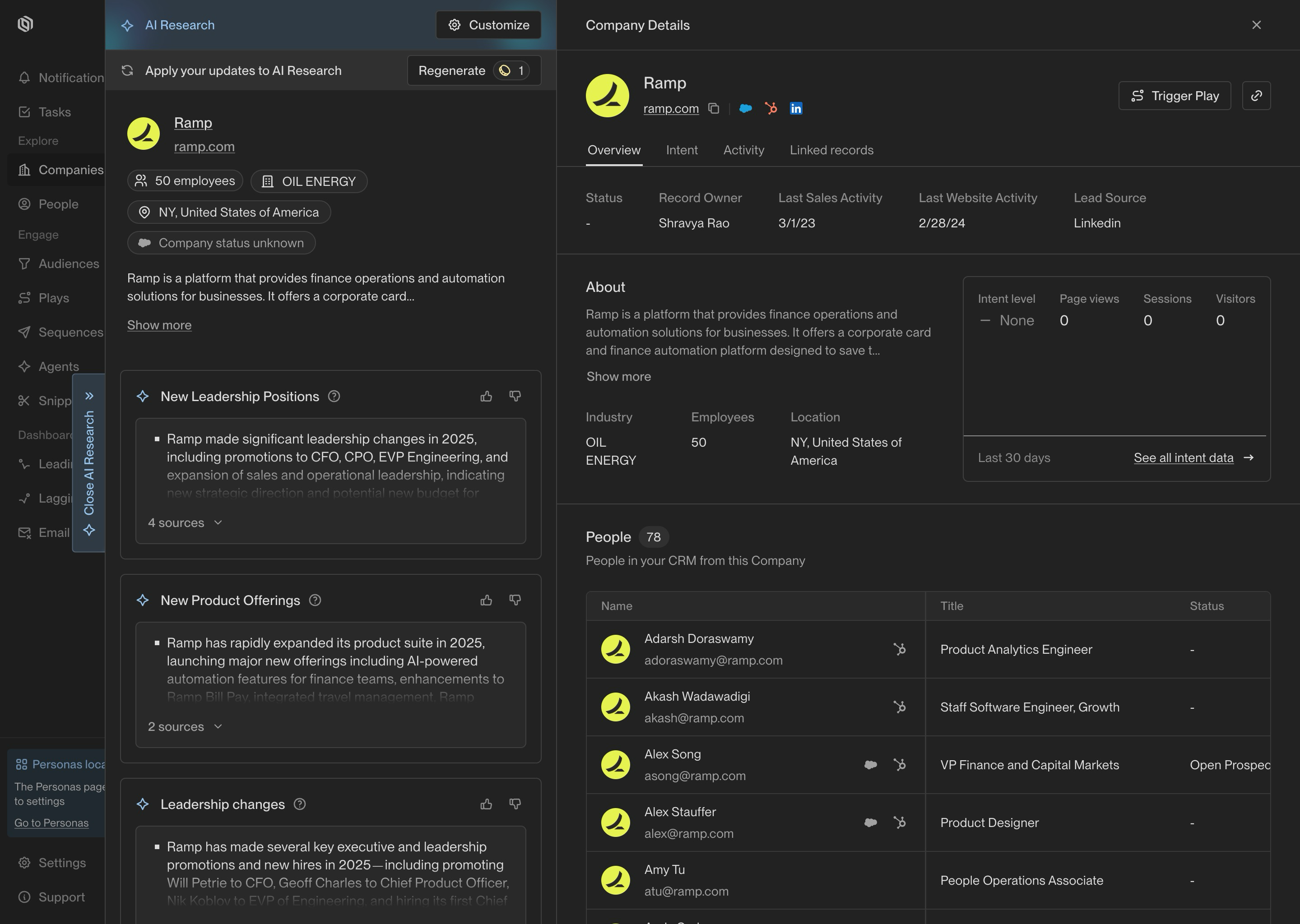 To access AI Research, you can click on the AI Research tab on any Task, Company, or Person page. AI Research will be automatically generated for Tasks, but for Company and People pages, they can be generated on demand.