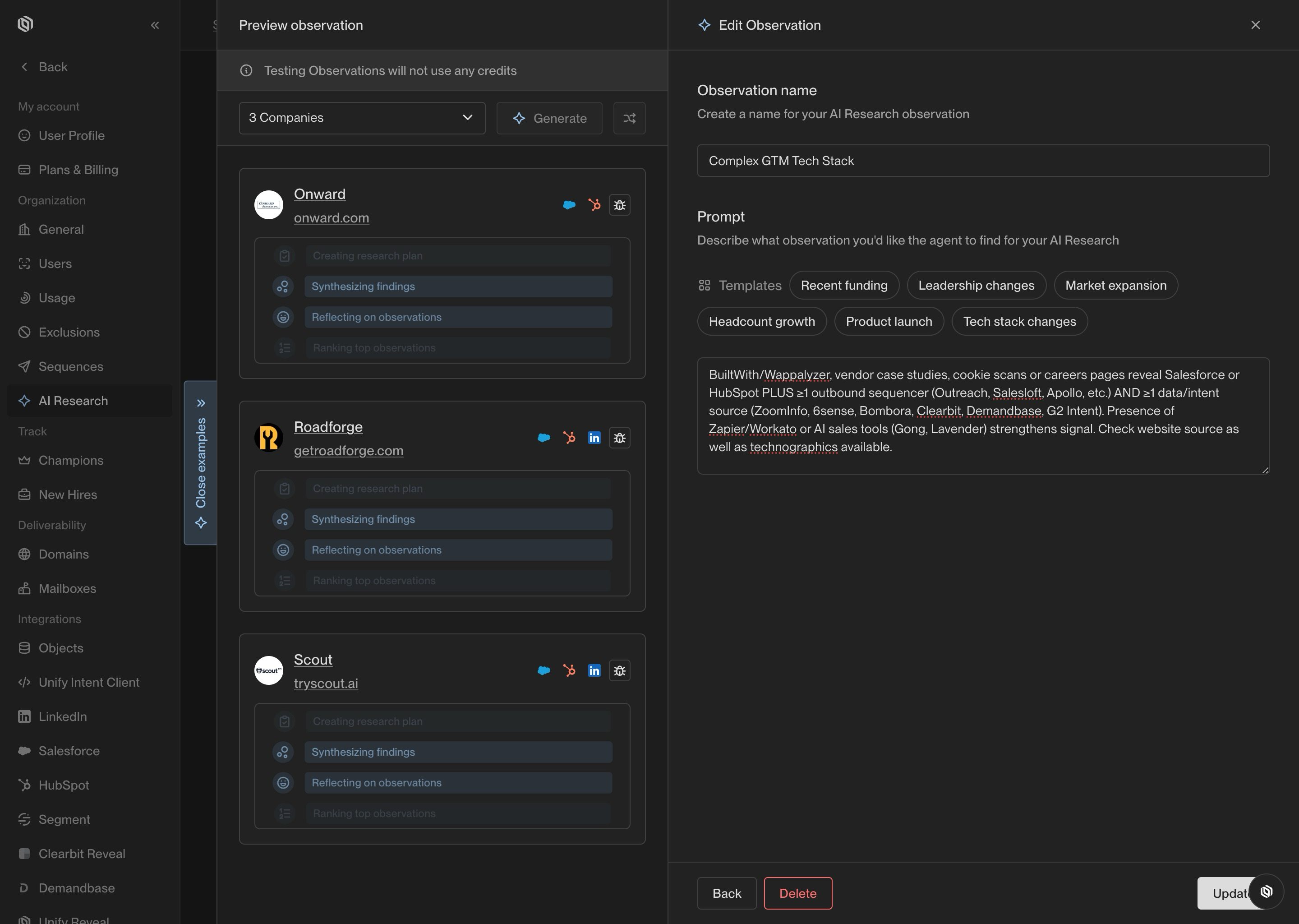 After providing a valid Observation configuration (Observation name and prompt), you can test your Observation to see if the configuration retrieves what you are looking for. You can either generate Observations for specific companies, or select a random sample of companies to test on. Use this page to experiment and iterate on the Observation prompts until you are satisfied with the resulting AI Research.To get effective Observations, ensure that your prompt explains all of the context that is needed to retrieve the information that you are looking for.