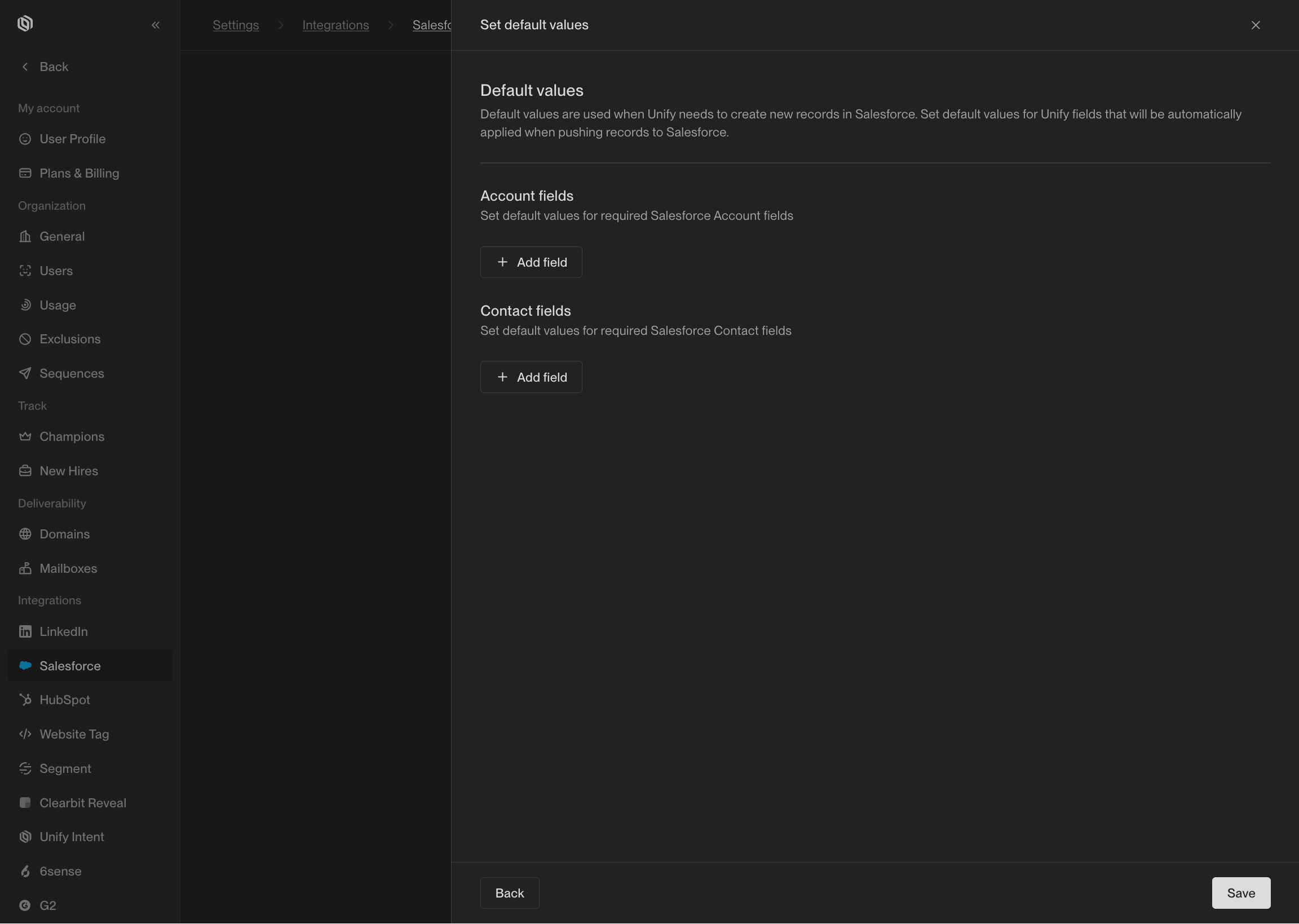 When Unify creates or updates records in Salesforce, it will populate each Salesforce field using the value in the corresponding Unify field. However, you can also specify default values to be used as a fallback. This can useful in a few different scenarios:- You may have custom fields in Salesforce that require a value