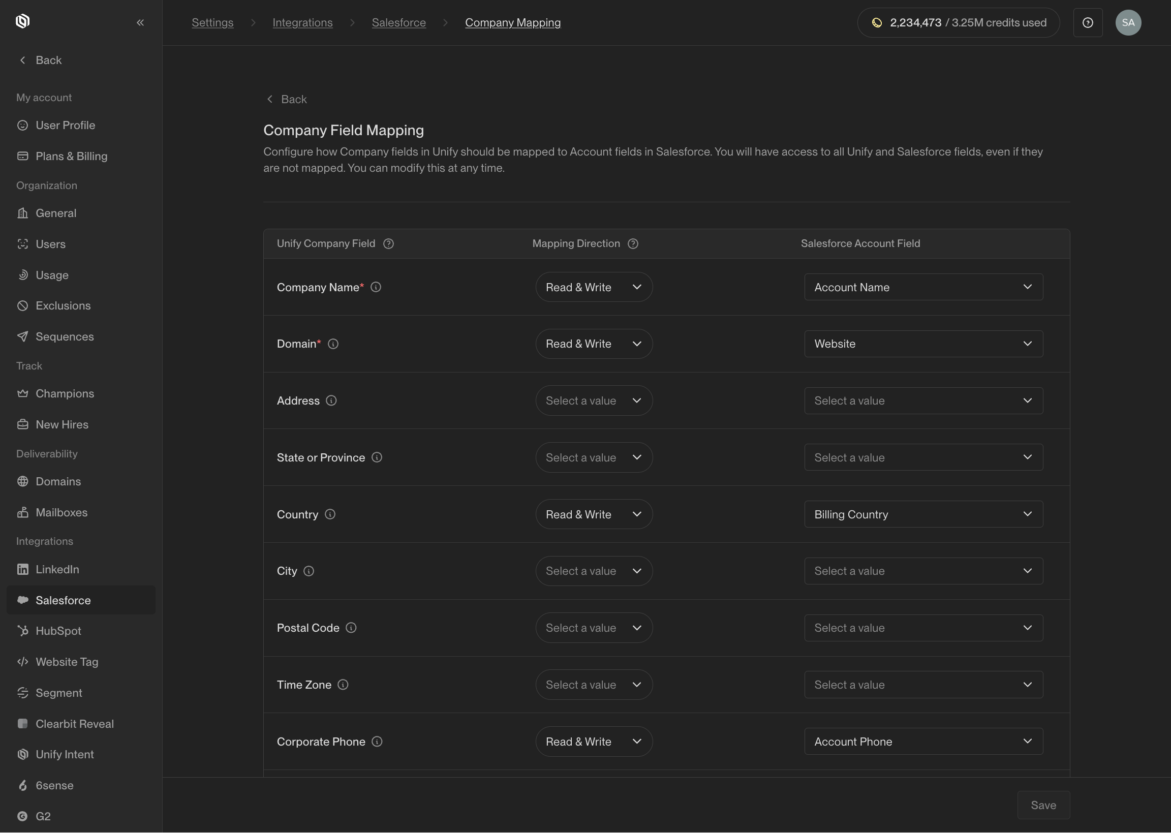 Configure mappings between Unify fields and Salesforce fields.