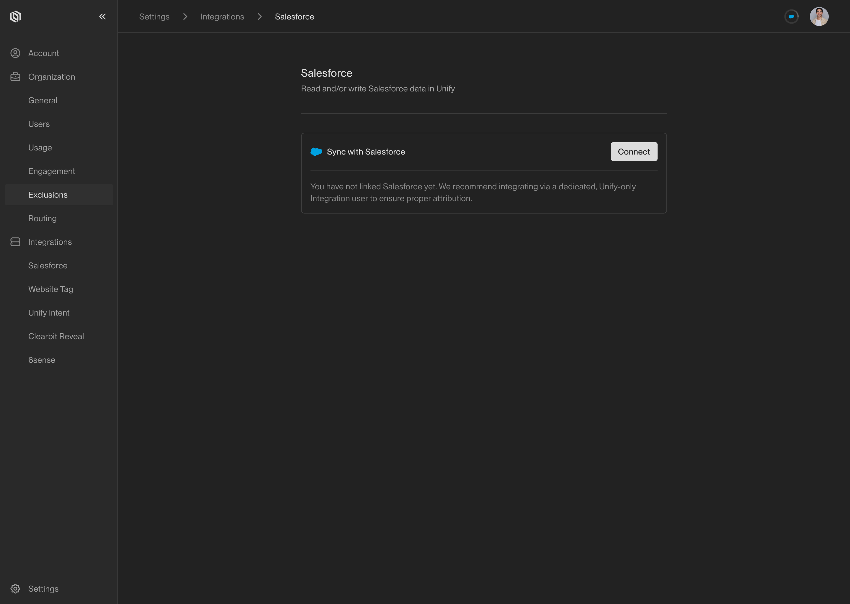 In just a few steps, you can connect your Salesforce instance to Unify and start syncing data bidirectionally. This unlocks a few key benefits when using Unify:- Salesforce records can be used to construct exclusions that prevent Unify from engaging with specific people or companies. For example, you can create an exclusion for all current customers or deals in progress.