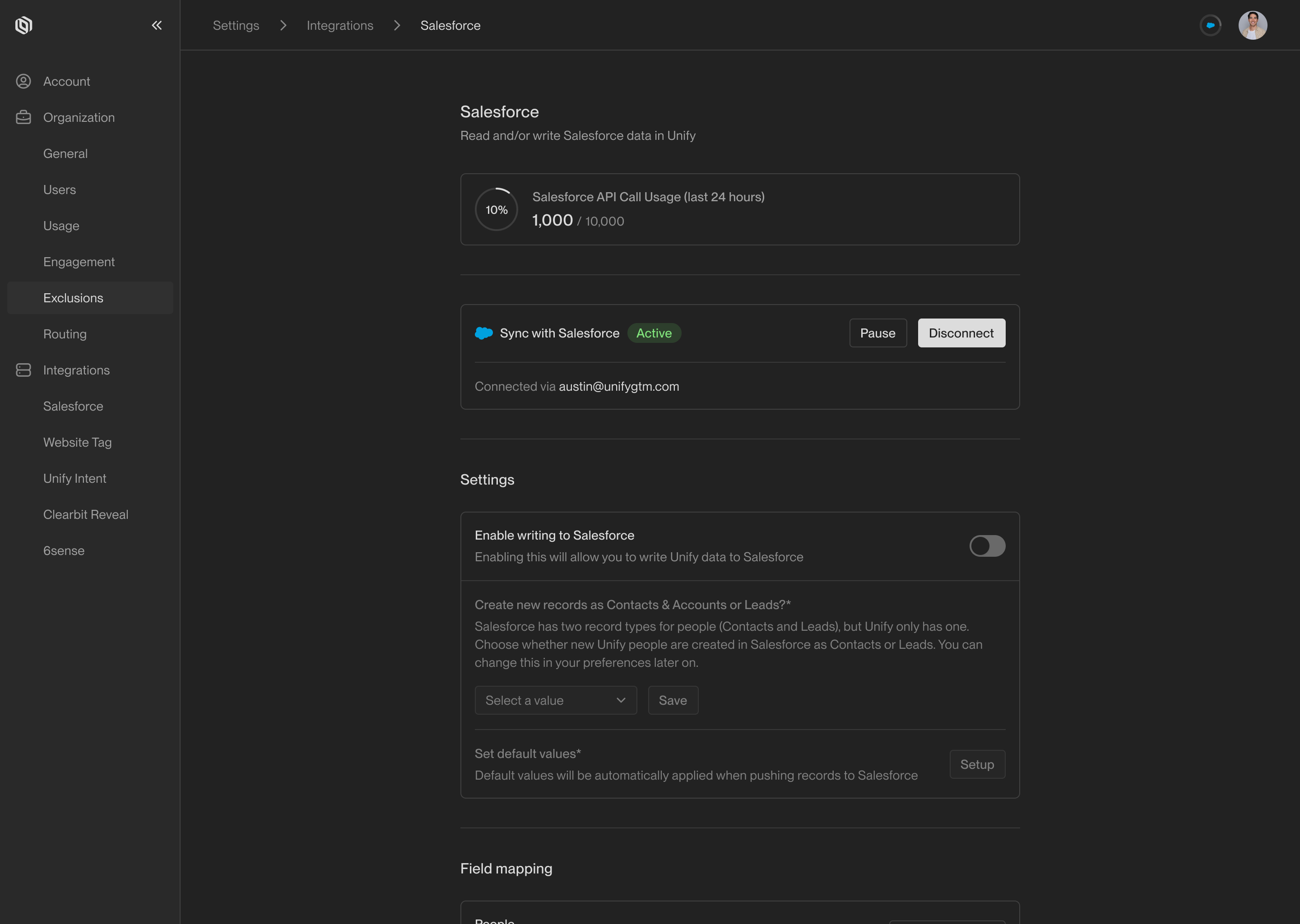 The field mappings page lets you customize which fields Unify can read and write.