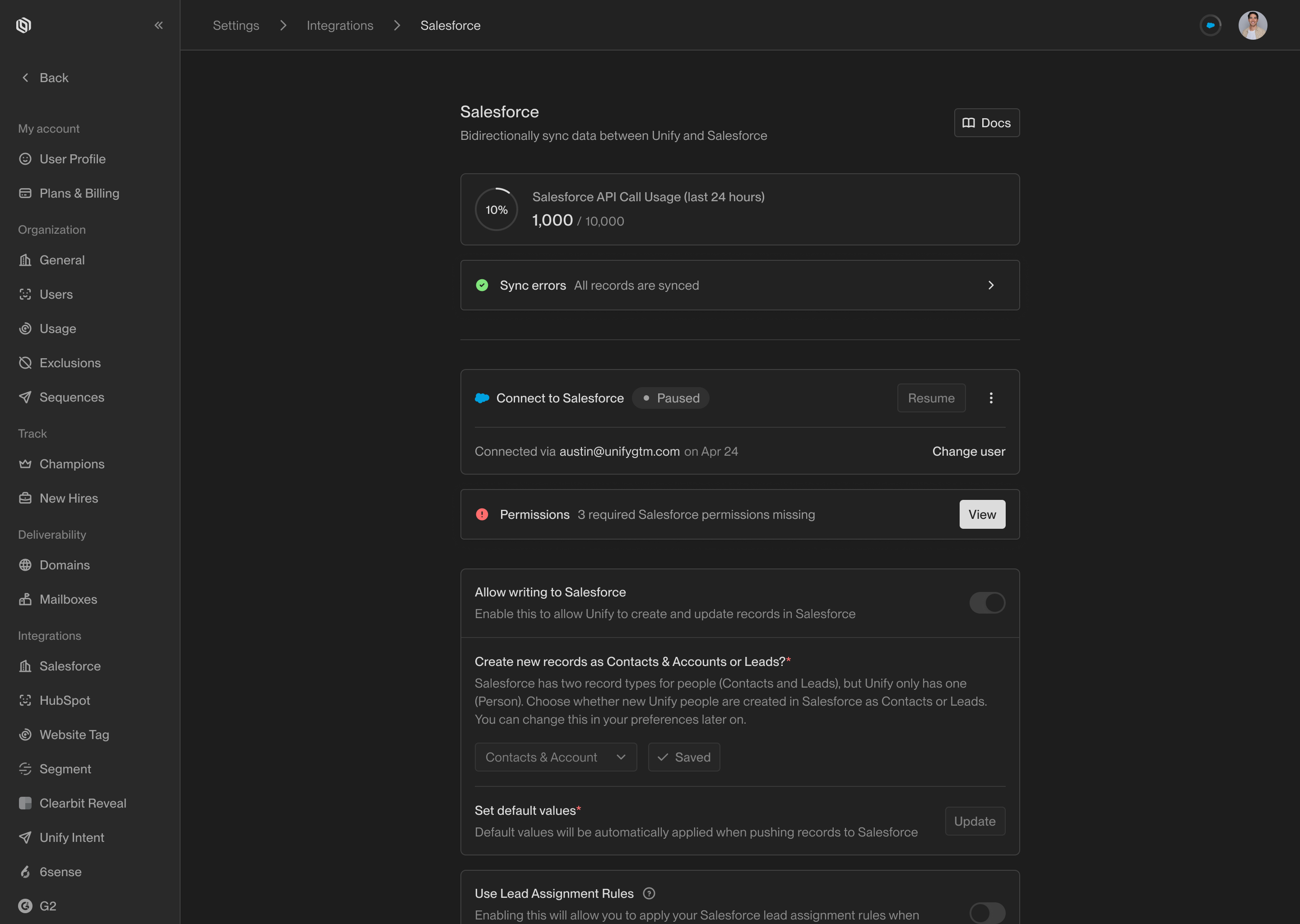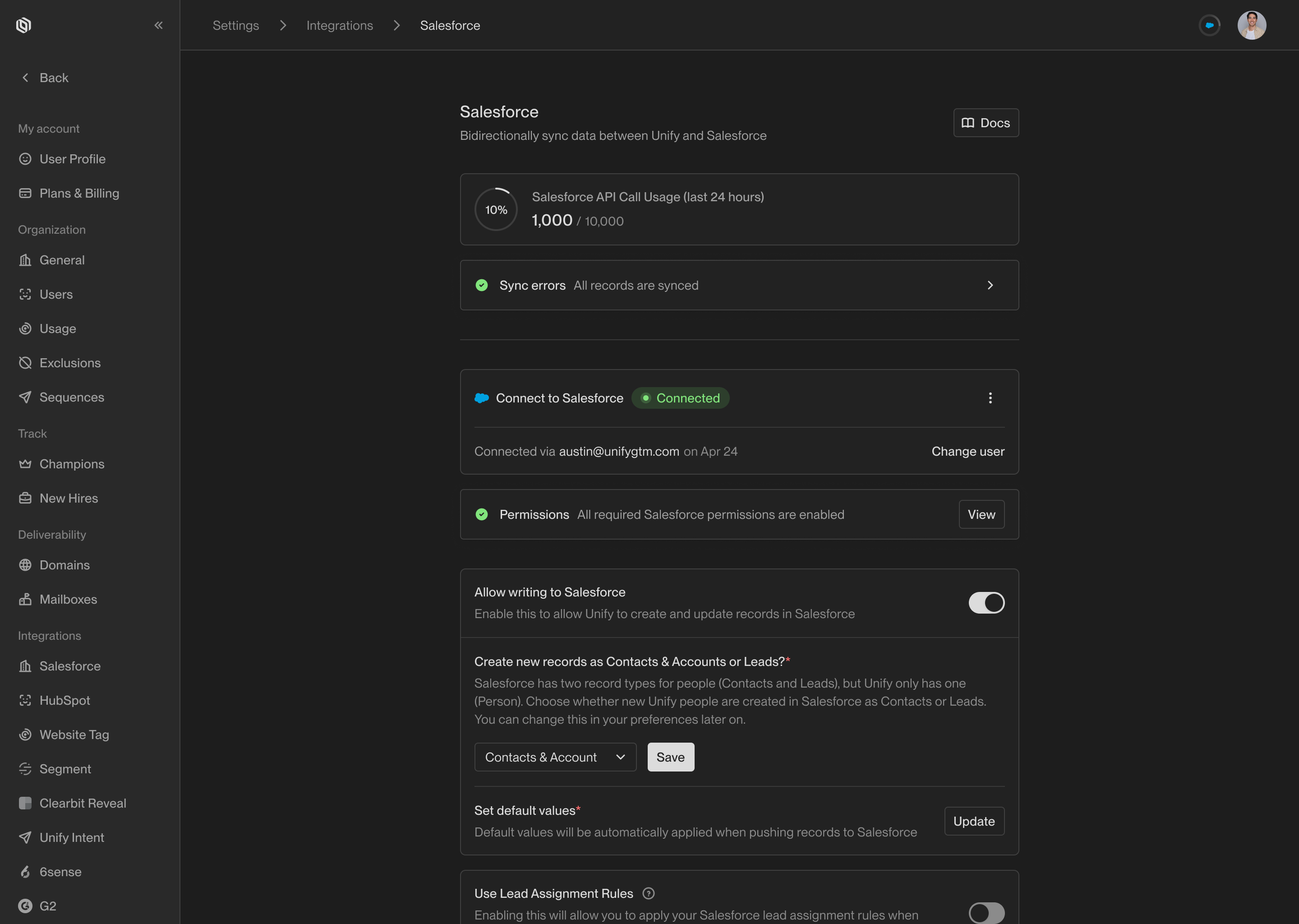 Enable writing to Salesforce. This will allow Unify to sync records back