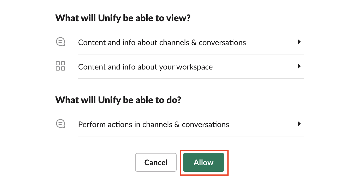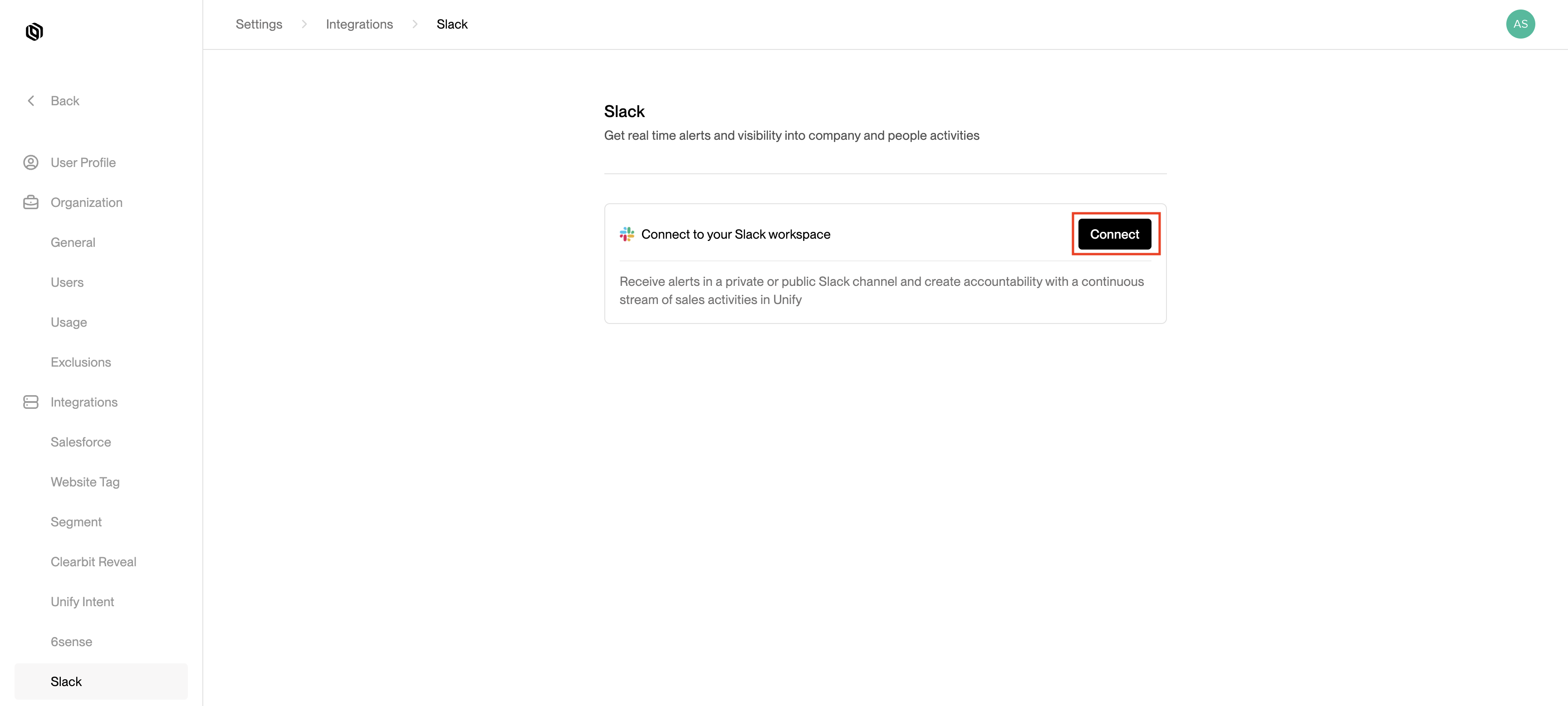 Go to Settings -> Integrations -> Slack in Unify and press the Connect button.