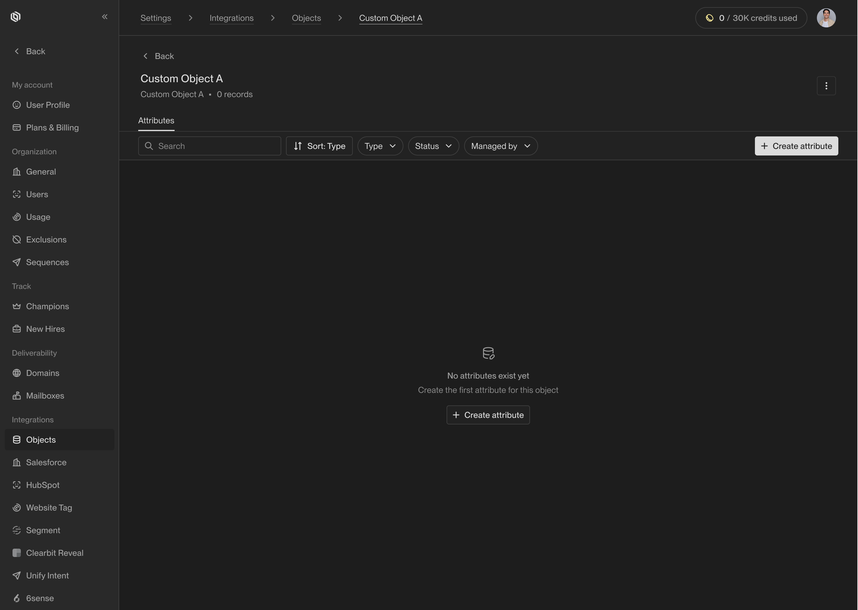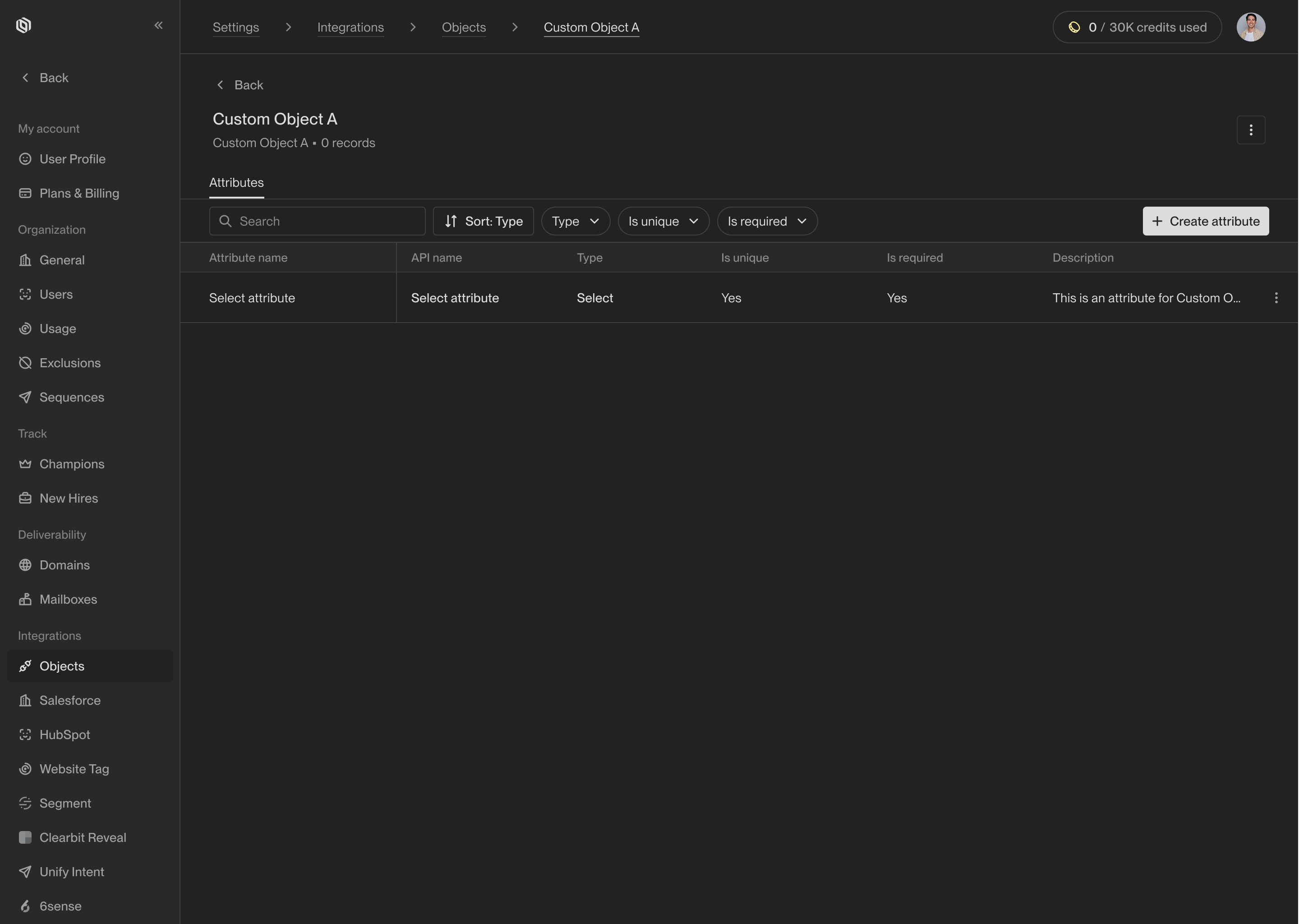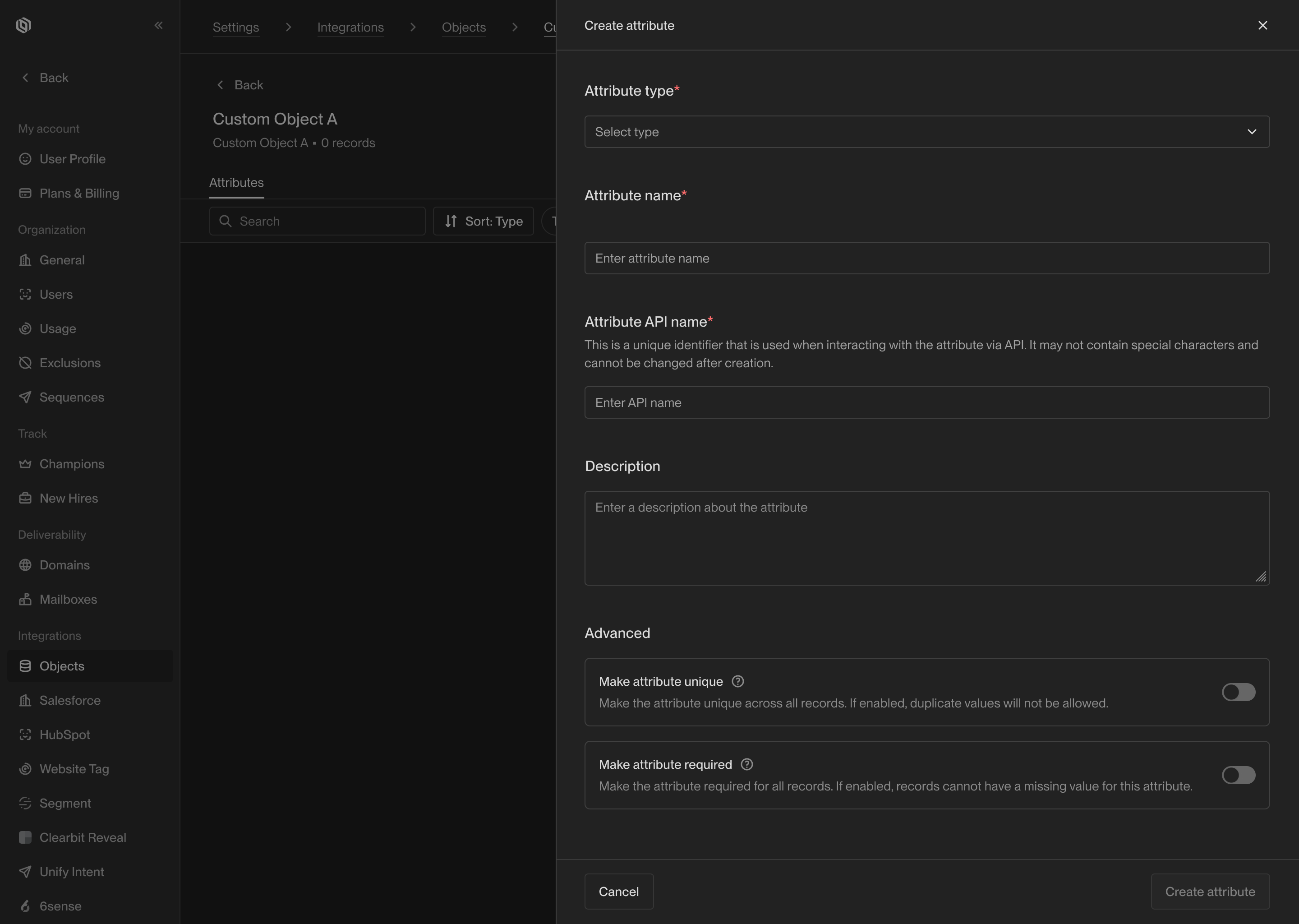 Objects in Unify have attributes, which are like fields or columns. Every attribute has a value type which defines what kind of values it contains. Attributes can be used throughout Unify, such when creating plays or personalizing emails. There are no limitations on the number of objects or attributes you can create. However, we recommend creating separate objects for each distinct data source to keep data organized.Create an attribute