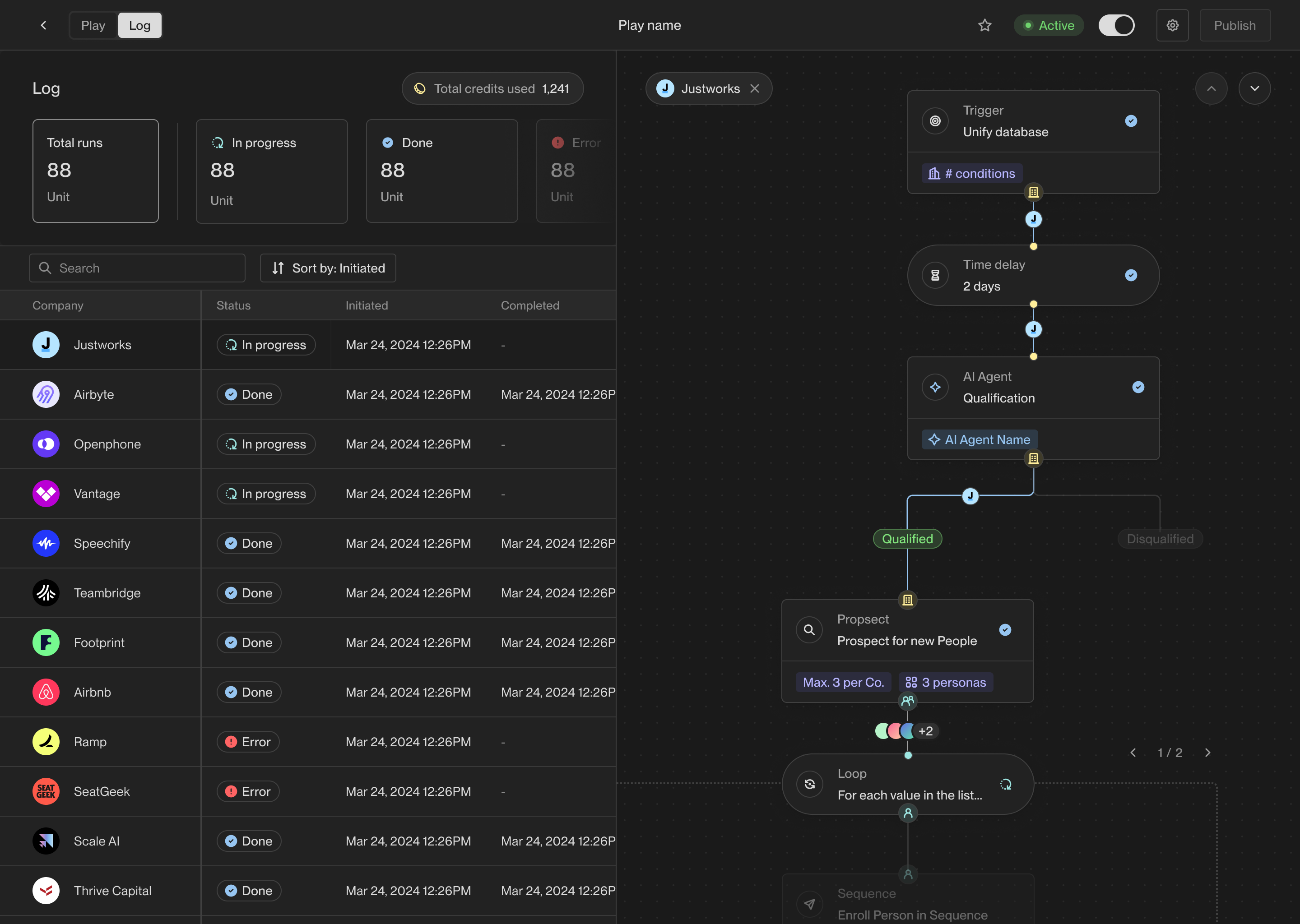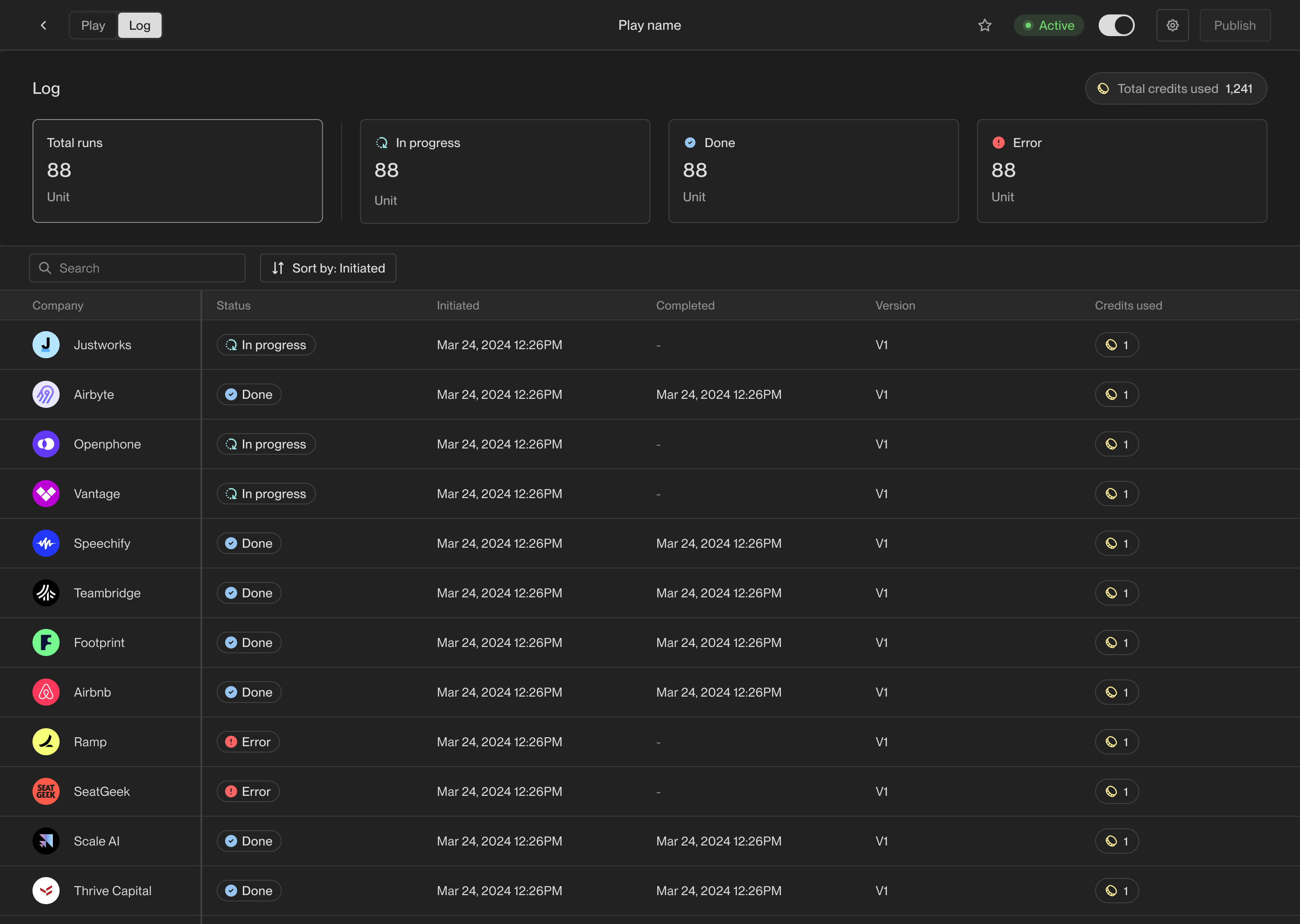 Once a Play starts running, you can view the logs to see which companies and people the Play has run on. In the top left corner of the Play Builder, click on Logs to see the full history of Play executions.
