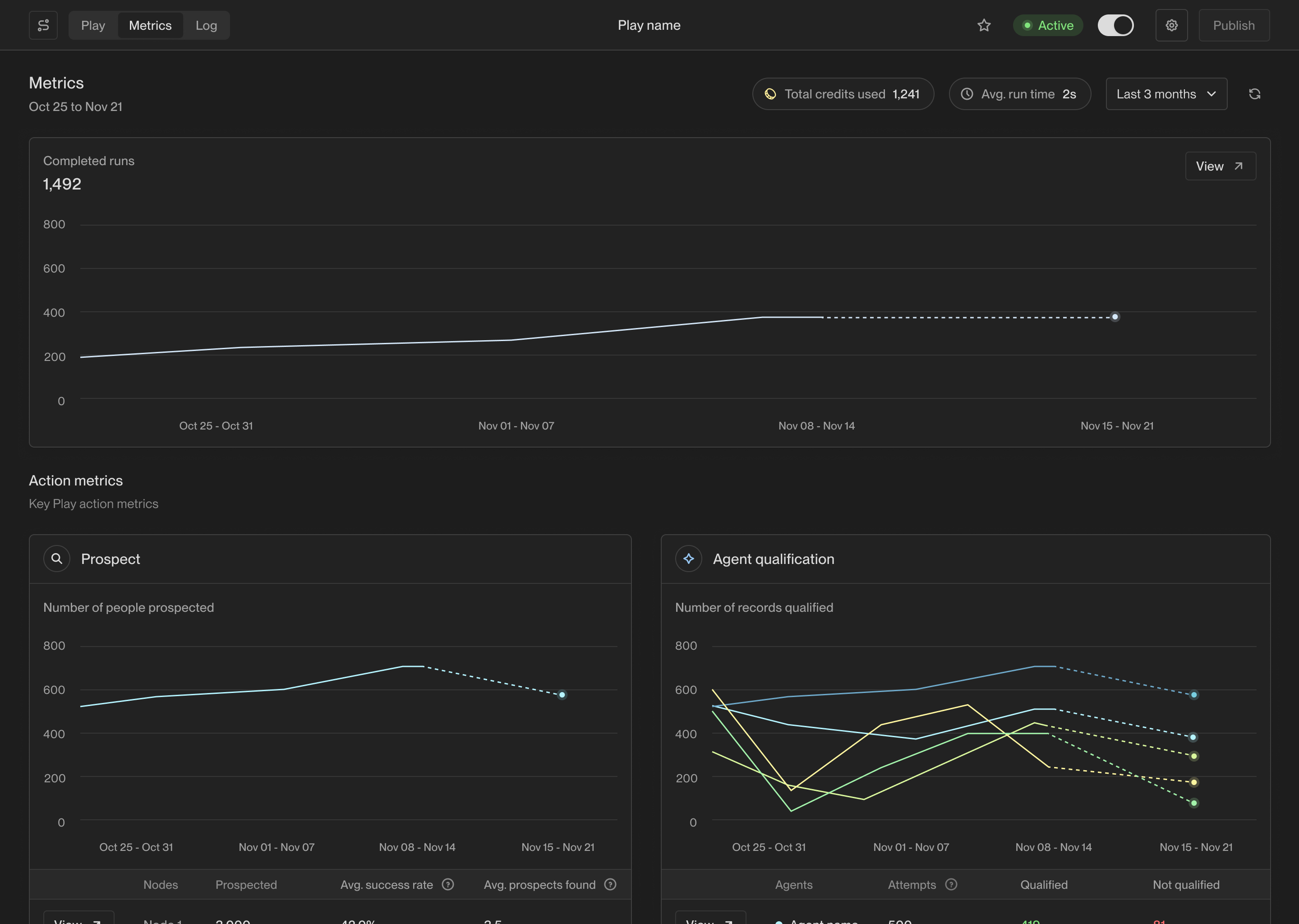 In addition to logs, you can view metrics for each Play to see how it’s performing over time. In the top left corner of the Play Builder, click on Metrics to see overview metrics and charts for the Play and each of its actions.