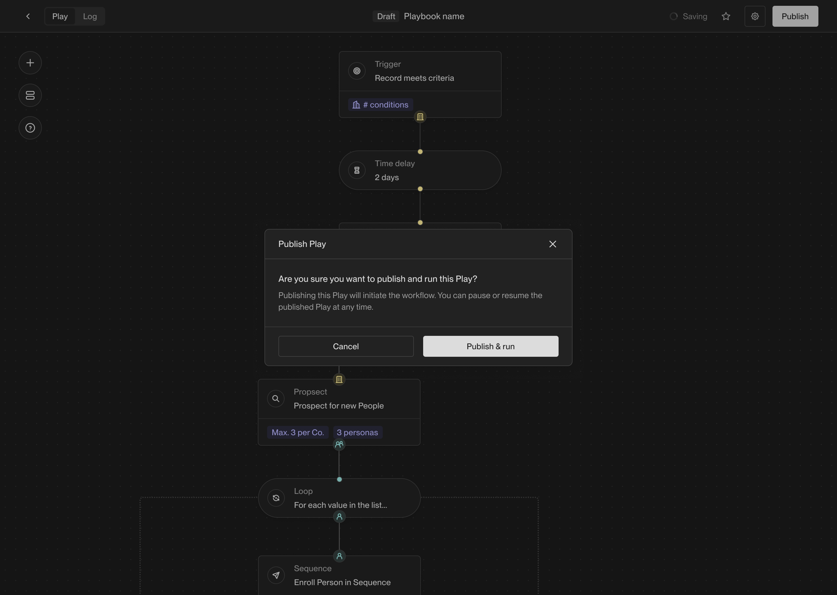 When you first create a Play, it is automatically saved as a draft. You can leave and return later to finish building the Play without losing your progress. Once you’re ready to start running the Play, you can publish it. Published Plays will run automatically based on the trigger you’ve selected. To publish a Play, click the Publish button in the top right corner of the Play Builder.