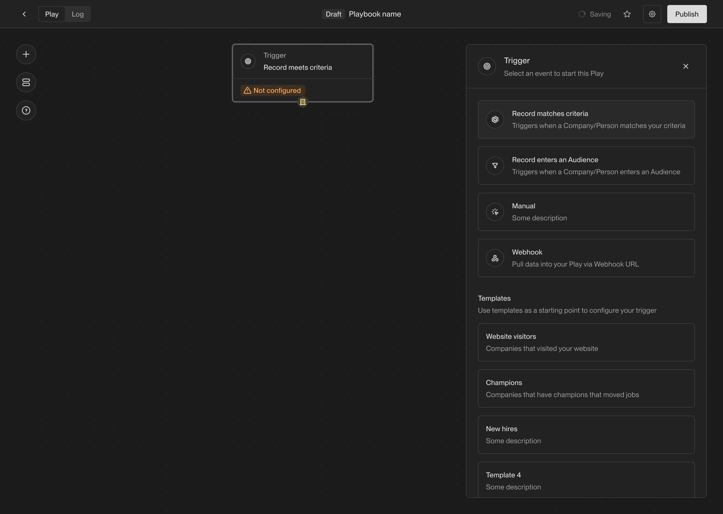 - Record enters an Audience: Run a Play once on every company or person that “enters” an Audience. Audiences can be reused across multiple Plays.