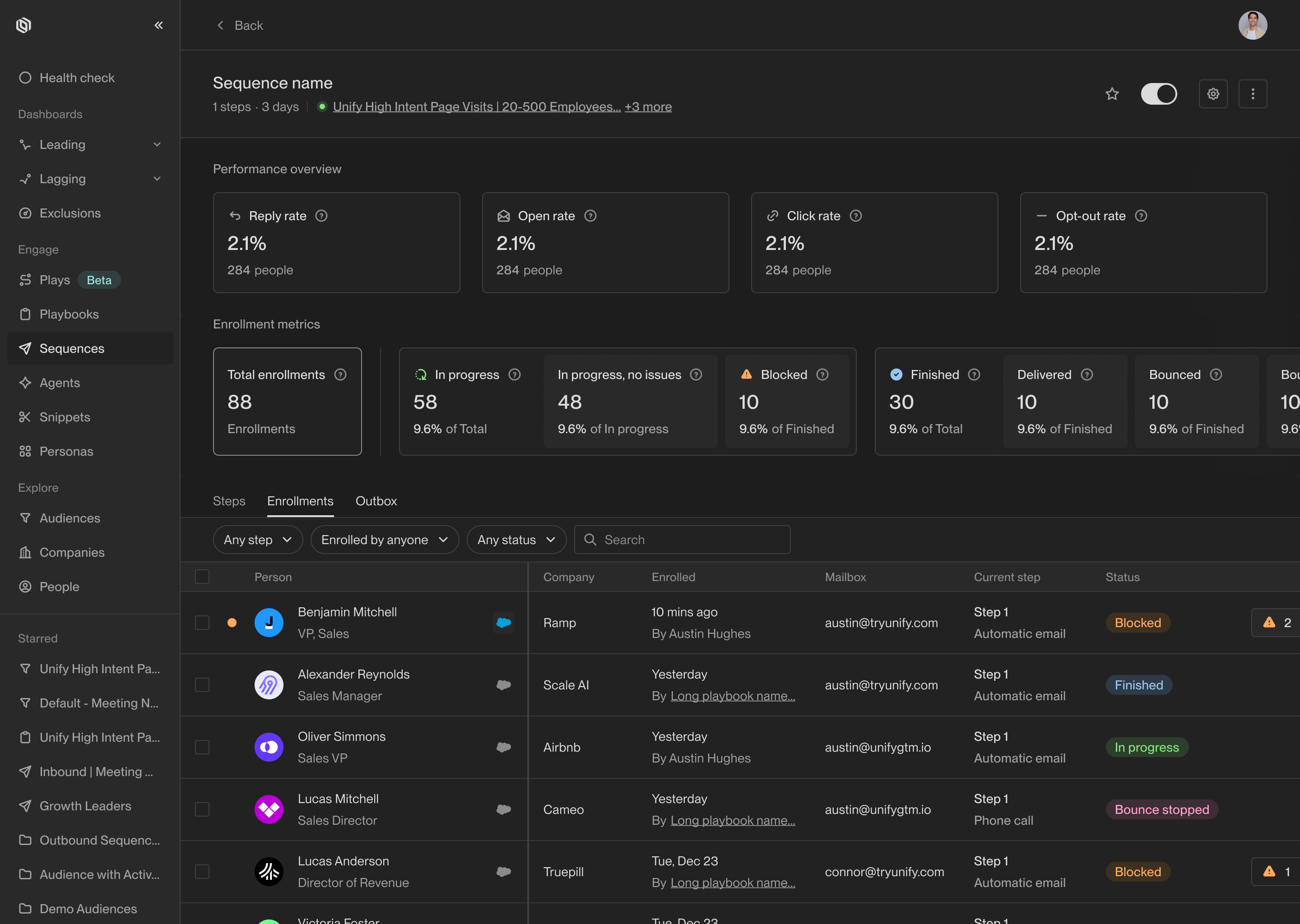 A sequence is a series of automated outreach steps that let you scale your outbound and measure its effectiveness. Sequences are purpose-built for modern outbound sales with native AI capabilities and deep integration with the Unify platform. Once you’ve created a sequence, you can enroll people in it to automate your outreach. Sequence enrollments can be performed automatically from Plays, but you can also enroll people manually. Enrollments can then be monitored from the sequence details page to track their progress.