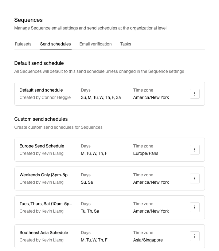 Custom Send Schedules define the specific days and time windows when Unify is allowed to send automated email messages through Sequences. Each schedule can be customized with:- Time zones — Align delivery windows with your target audience or team region (e.g., America/Los Angeles, Europe/London, Asia/Singapore).