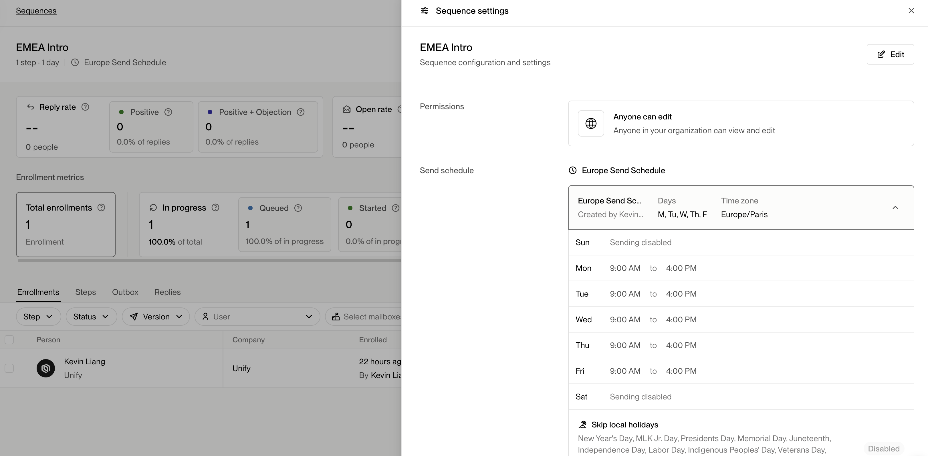 To change which Custom Send Schedule a Sequence uses:- Click Edit in the top-right corner of the Sequence Settings drawer.