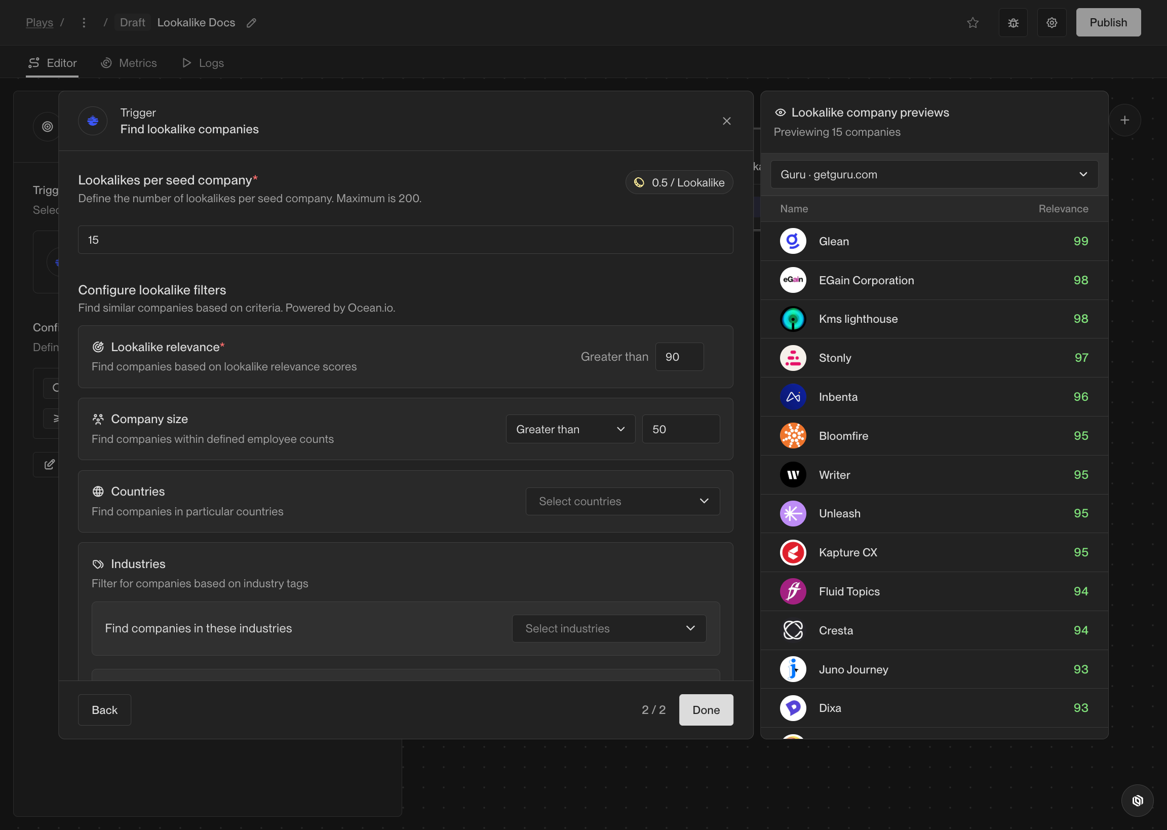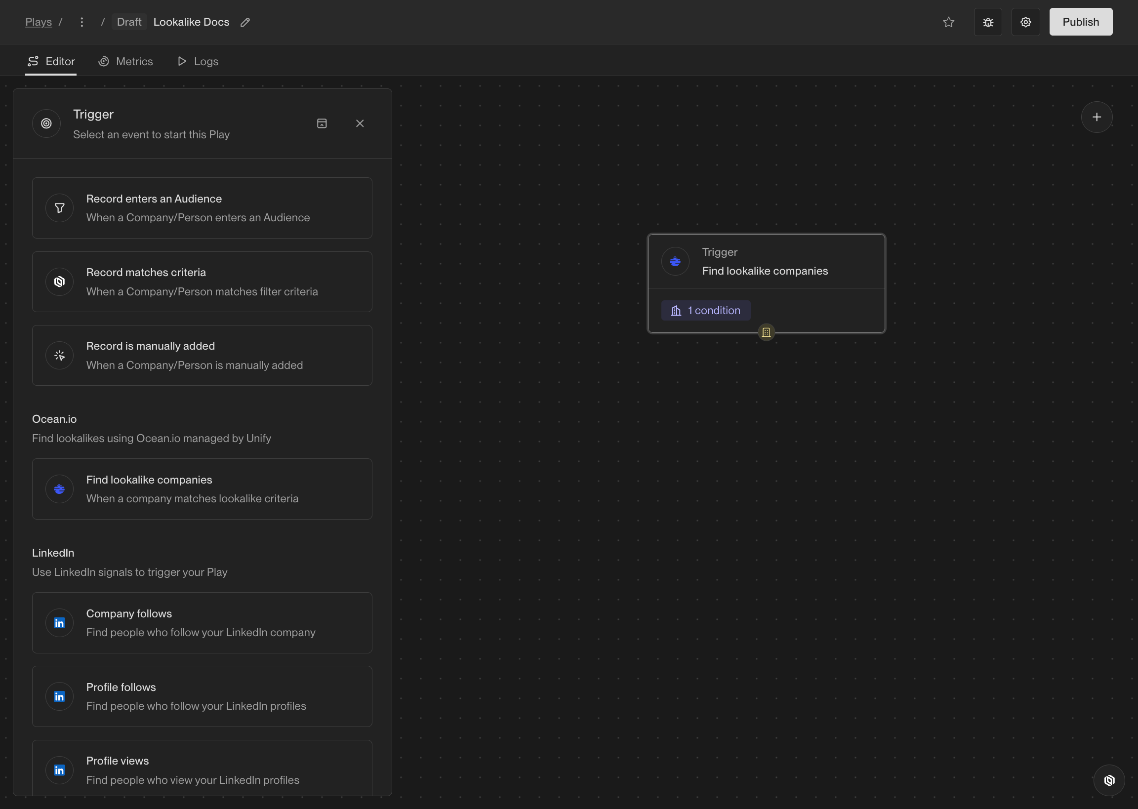 We’ve partnered with Ocean.io — a leading Lookalike data provider — so you can run automated Plays that target lookalikes of your most successful customers. The integration is fully managed by Unify and included in your plan, so no additional subscription or setup is required.Setup