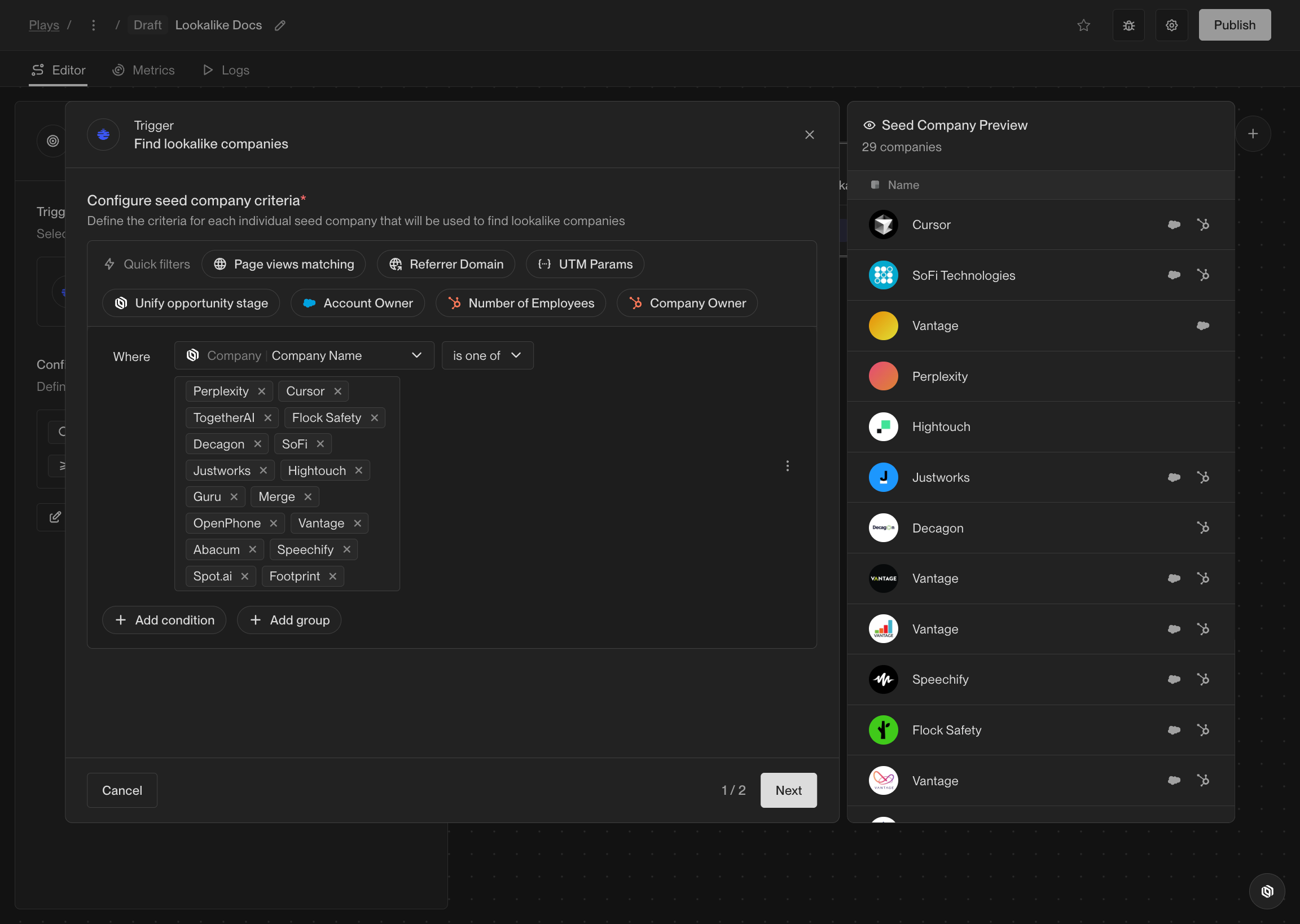 First, configure the seed companies you want to find lookalike companies for. You can do this by adding filters to select companies that meet your criteria, just like building audiences.