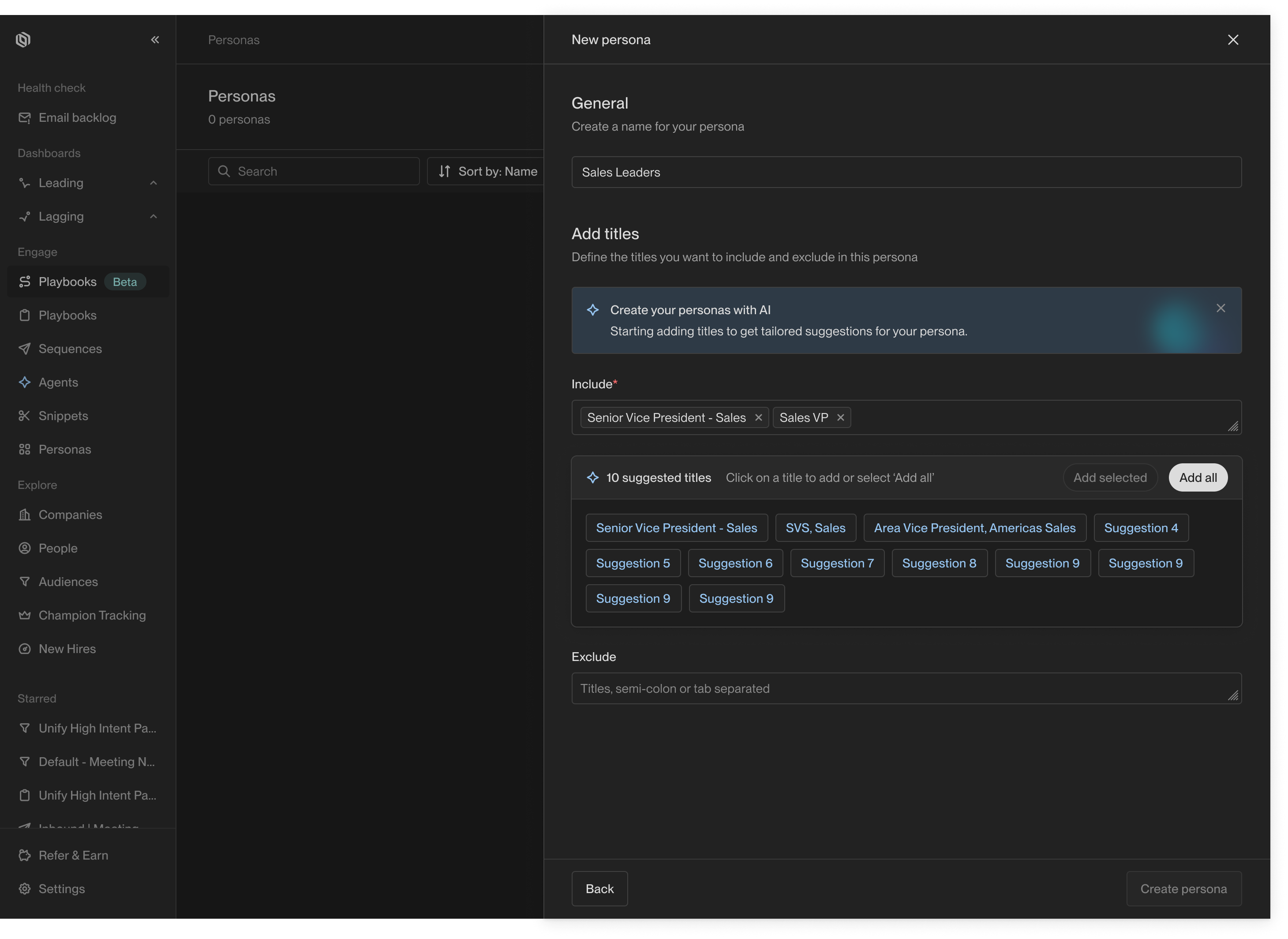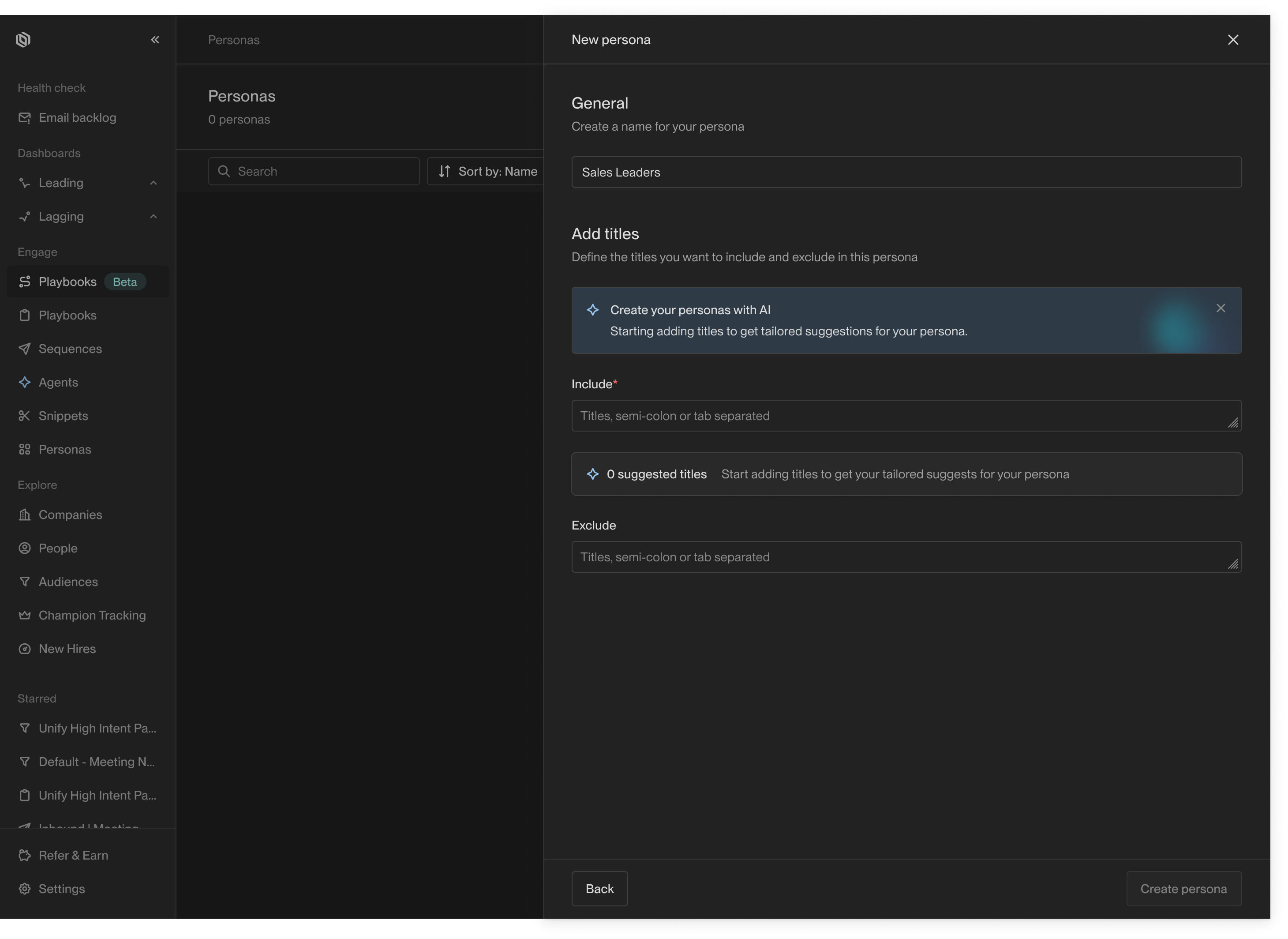 Personas are collections of job titles that you want to target. Each persona consists of a list of titles that you want to include and exclude. Personas can be used throughout Unify, such as when prospecting or routing people to different sequences.Create a persona